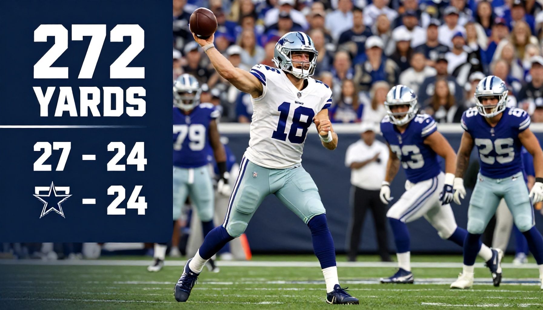Dak Prescott led the Dallas Cowboys with 272 passing yards against the New York Giants. The 35-year-old quarterback completed 27 of 43 attempts, but ultimately fell short with a 27-24 loss.