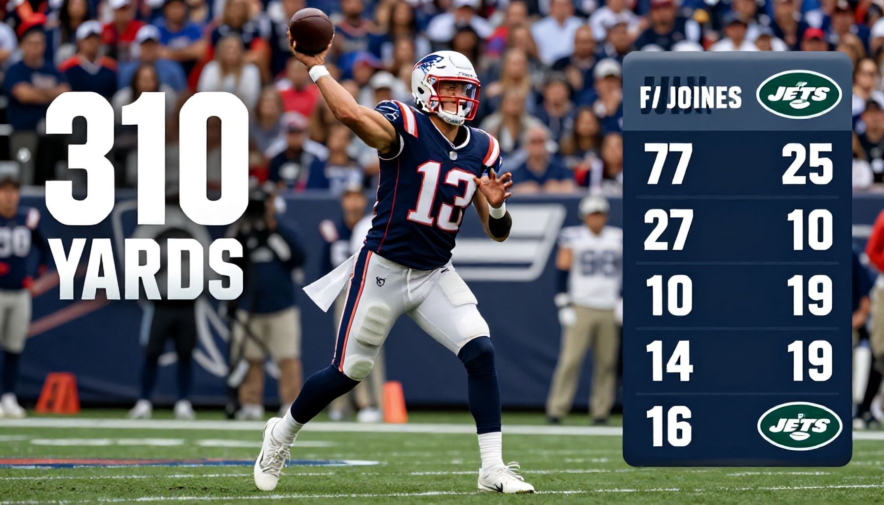 Jones’ 310 passing yards marked his sixth career game with at least 300 yards, tying him with Tom Brady for the most such games by a Patriots quarterback in their first two seasons. His accuracy was impeccable, connecting on deep passes and threading the needle on intermediate routes. The Jets’ defense, known for its aggressive blitzing, struggled to rattle Jones, who maintained composure throughout.